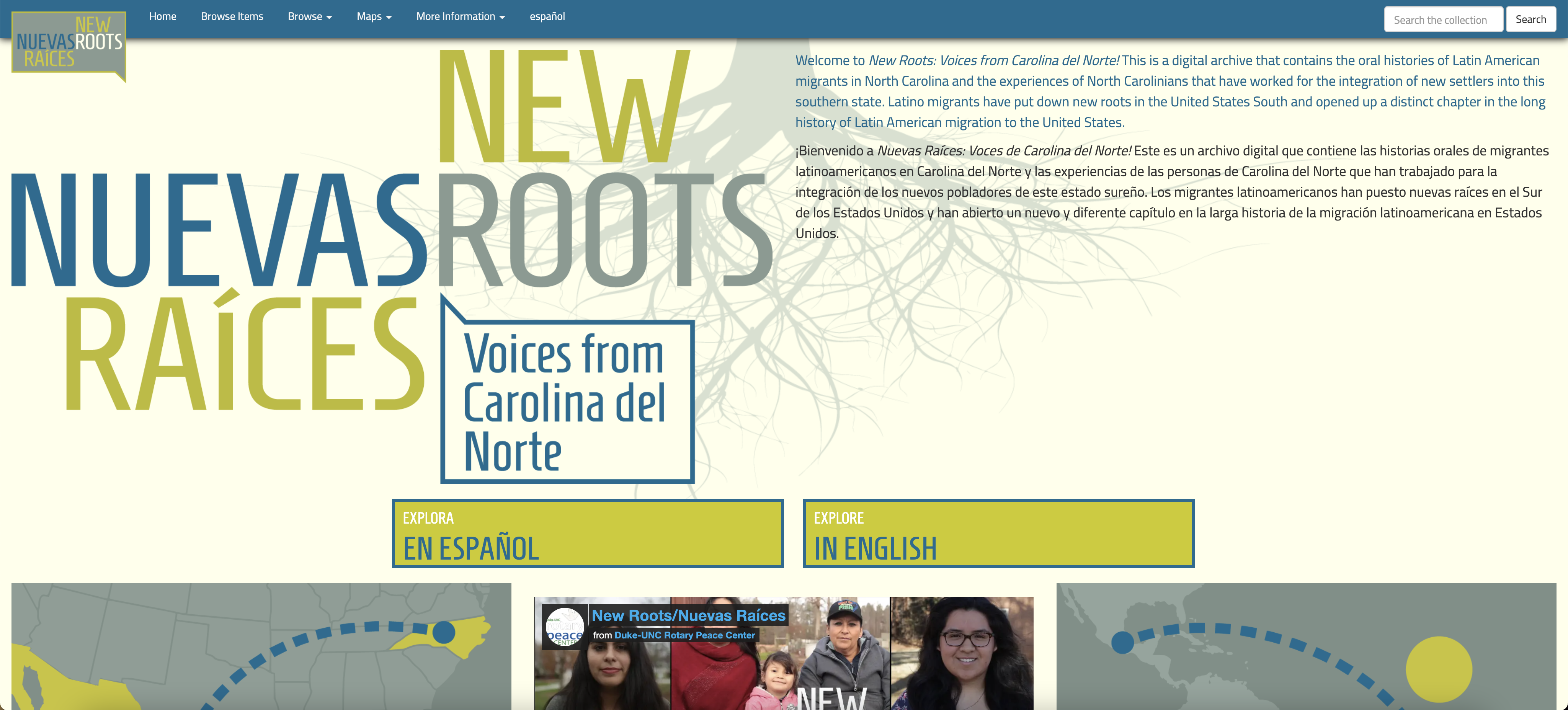 Screenshot of the New Root/Nuevas Raíces homepage