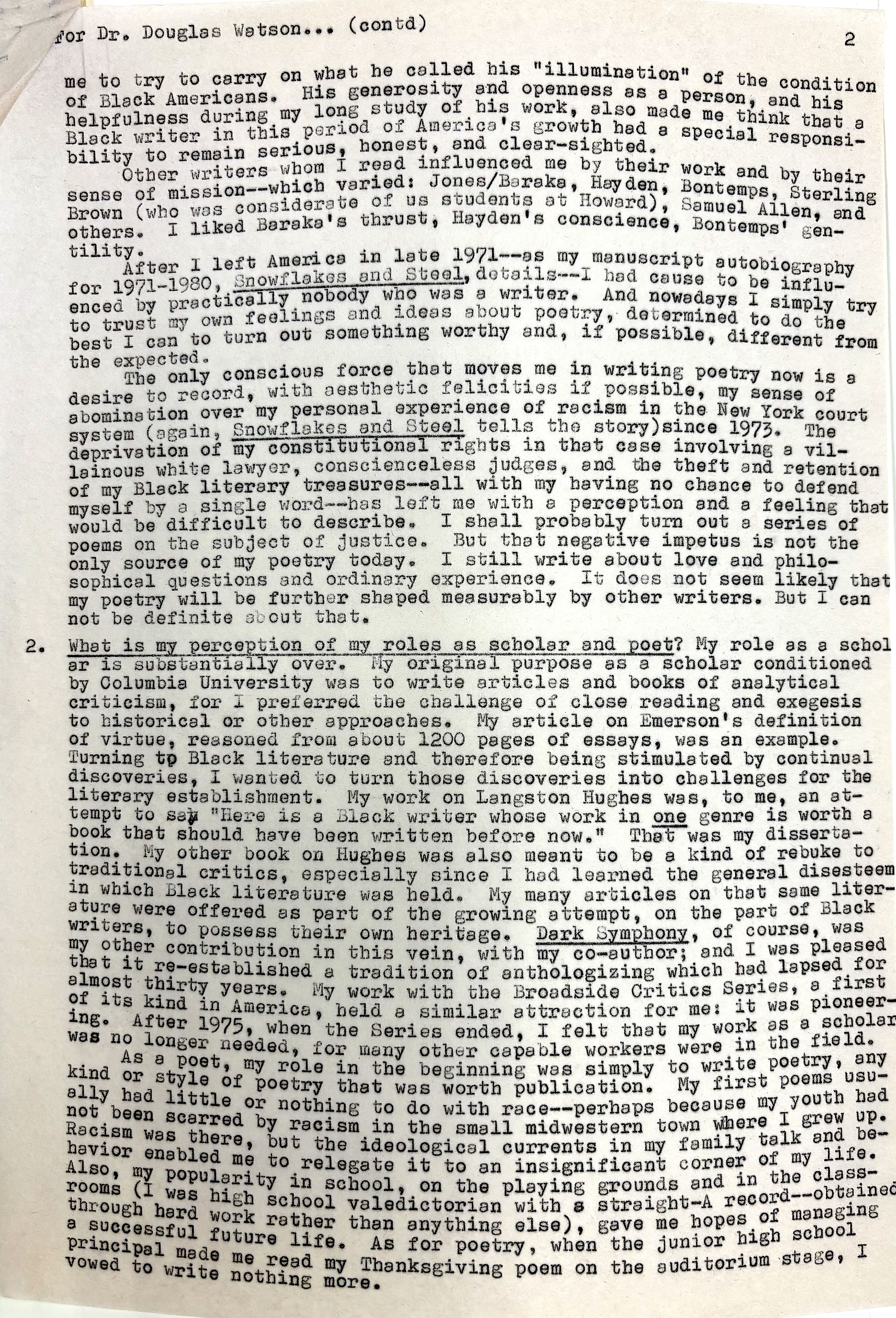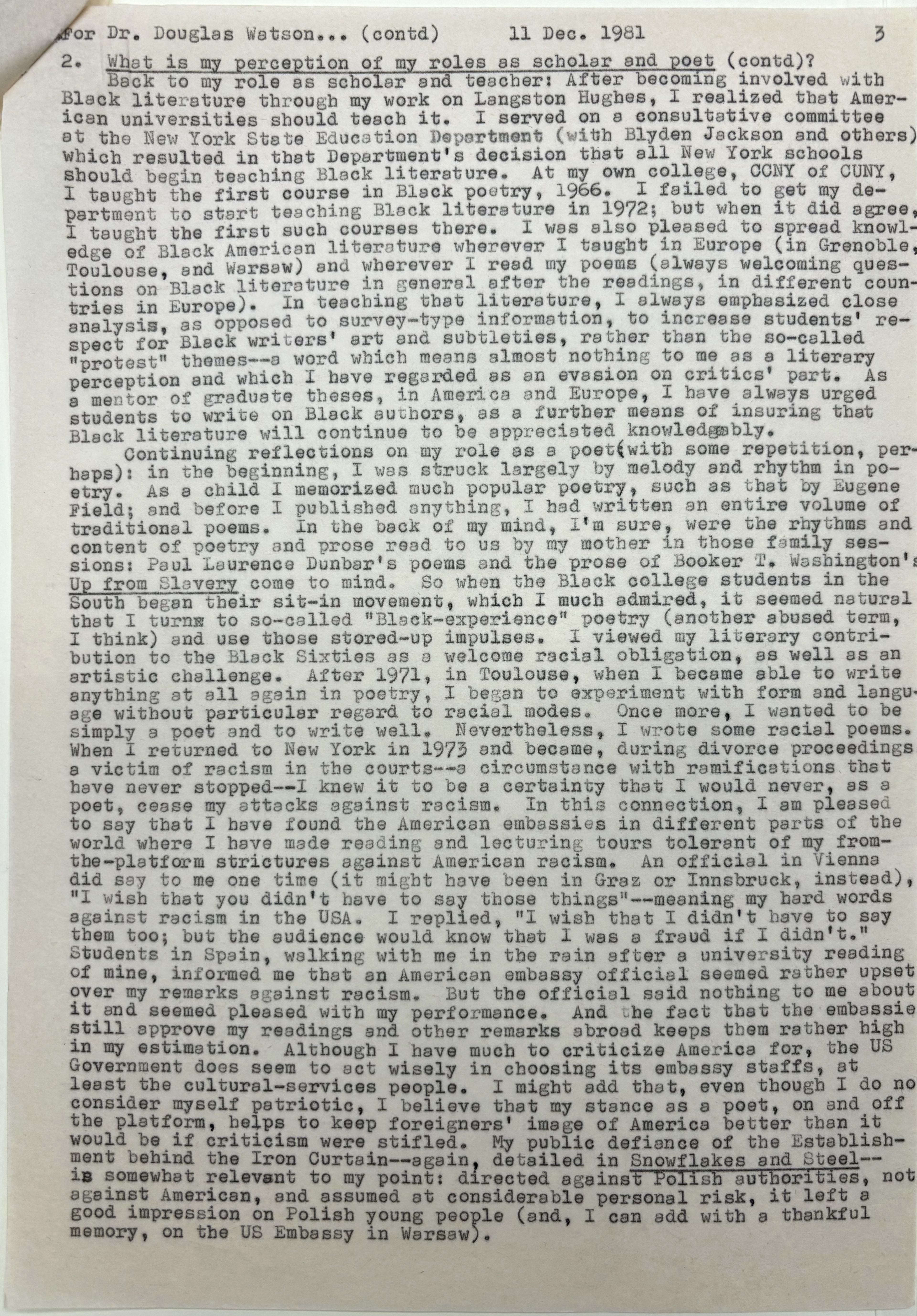 The James A. Emanuel Project’s Letter Collection contains nine-seven pages of letters with two-main purposes. The first purpose is to provide an intimate view into Emanuel’s life and writings through letters to mentors, colleagues, collaborators, and friends. However, the correspondences between Emanuel and Senator Robert F. Kennedy in 1967 are an outlier in this collection. The second purpose is to reveal a sense of how he built his character and career in community with others.