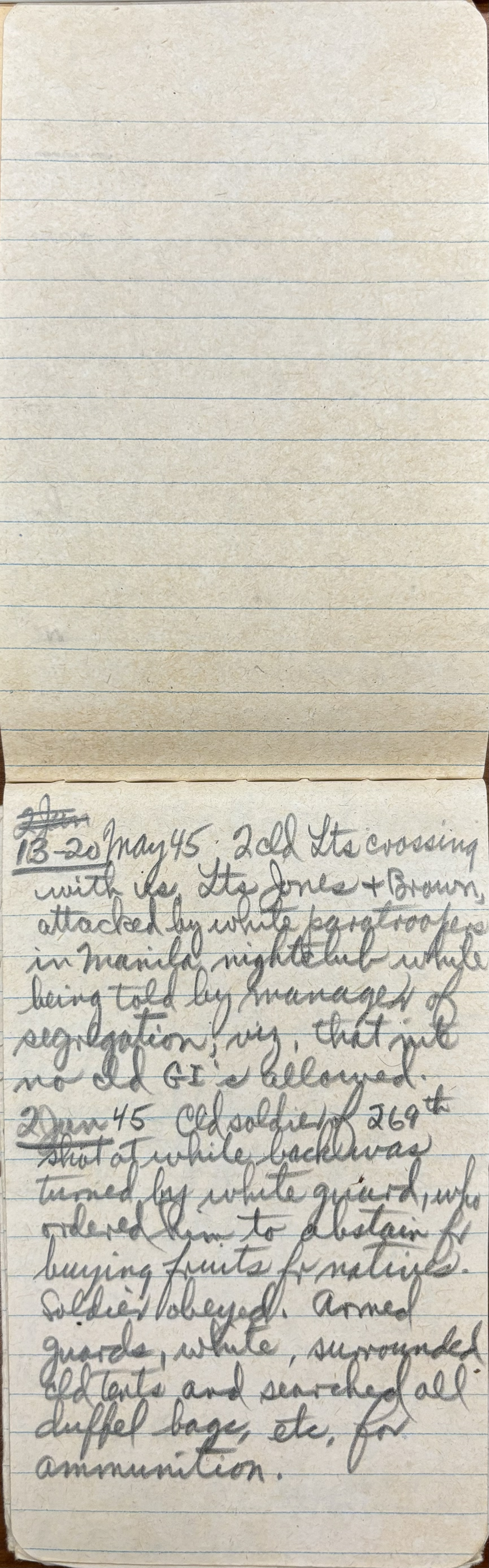 "13-20 May 45 2 cld Lts crossing with us. Lts Jones & Brown,  attacked by white paratroopers in Manila nightclub while  being told by manager of  segregation, viz, that nite  no cld GI’s allowed. 2 June 45 Cld soldier of 269th  shot at while back was turned by white guard, who ordered him to abstain fr buying fruits for natives. Soldier obeyed. Armed Guards, white, surrounded cld tents and searched all duffel bags, etc. for ammunition. "