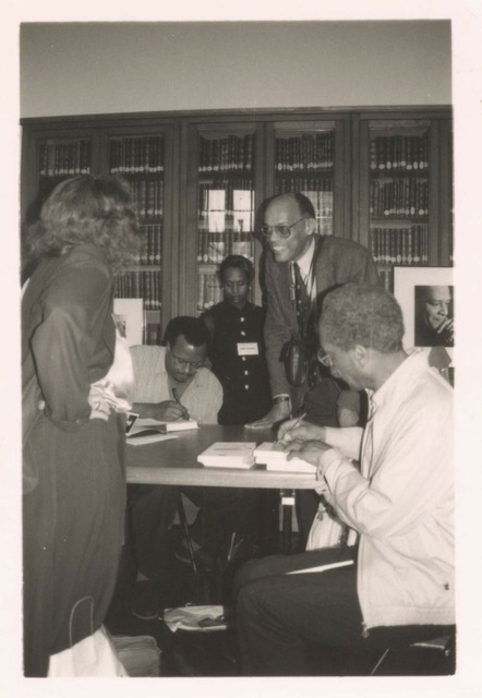 LaSorbonne Nouvelle (Salle Bourjac) book signing, 27 April 1996, Jake Lamar, the other writer, Dr. Wesley F. Johnson of San Francisco standing.