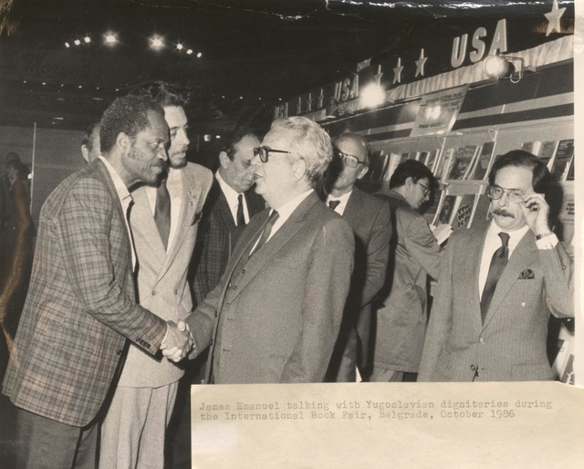 Photograph of James Emanuel shaking hands with Yugoslavian dignitaries. Attached with note: "James Emanuel talking with Yogslavian dignitaries during the International Book Fair, Belgrade, October 1986"