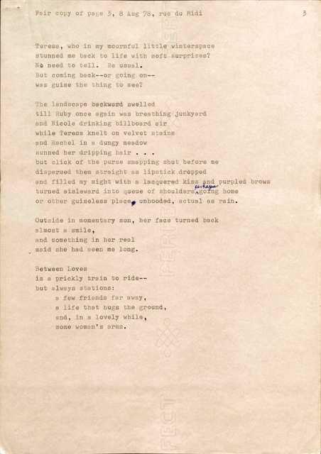 "Partial fair copy of poem begun 19 Jan. 79, av. Du Maine, Paris, 20.1.79, 10:50 a.m.—11:37; 11:45—12:00; 3:22—4:24 (with changes)   THE BOAT BASIN, YEARS LATER  A January moon, almost, and flat-blue sky from the Obelisk down to the Louvre beckoned me up thin, white steps and past a rigid dog sniffing an icy footprint melting in the sand, past woodcutters bent over in a truck, unmoving, as if to hide behind their planted cross: it said historic trees were cut to guard the public’s ... the missing word had smashed the corner of the sign.   It was in front of me somewhere, the Boat Basin, floating up-- no, I was stepping downward-- [those] more disappearing footprints fitting mine, loosening beneath the sun, stopping. Looking up, I saw them scattered around me, people sitting bent and curved like deep-freeze packages slow thawing in [a] some drafty door propped open, their scarves poked out for breathing, their bones all angles, gloved and padded, positioned as if for a vigil.  Partly guided by their gaze, I kept [the] a chosen path until the Boat Basin widened in my eyes, ten years of sudden changer [dropping] beaming like icicles dropping silently around the border of the pool, breaking fitful gleams across my sinking memory of sailboats out of hand, their gleeful little captains by turns awestruck and then distressed to see their bobbling colors drawn away, drifting to the center of the sea-- and if brought back by stratagems [somewhere buried] of strangers in the crowd, they anchored changed, less ownable for having sailed away alone.  The dead of [winter this [undecipherable] time] winter tightened by brow its changing spirit [undecipherable] warmest at the center of the pool [*put on line alone*] in the bending statue there pouring Sea God potions into the Boat Basin, keeping its heart alive, companionable, [but] while its slowly pulsing ripples, circling outward, stopped suddenly on ice, [recoiling from the frozen scene] recoiling from the frozen scene I inward saw, and outward woke to like a little dream:   "