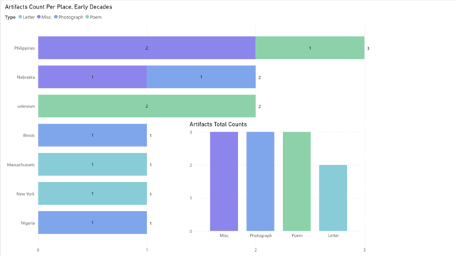 This visualization of the James A. Emanuel Collection displays counts of artifact types (Letters, Miscellaneous, Photographs, and Poems) and the places referenced in these artifacts that are dated, created, or occurred between the 1920s and 1950s.