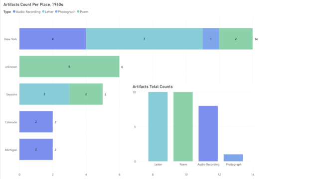 This visualization of the James A. Emanuel Collection displays counts of artifact types (Audio Recordings, Letters, Photographs, and Poems) and the places referenced in these artifacts that are dated, created, or occurred in the 1960s.