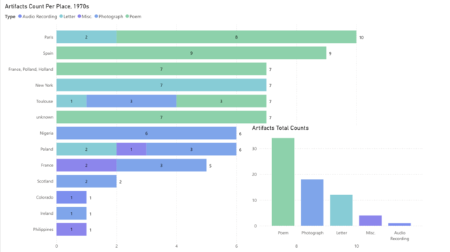 This visualization of the James A. Emanuel Collection displays counts of artifact types (Audio Recordings, Letters, Miscellaneous, Photographs, and Poems) and the places referenced in these artifacts that are dated, created, or occurred in the 1970s.