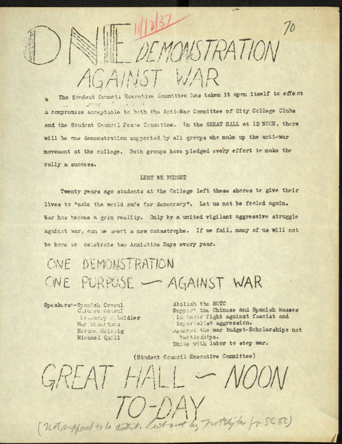 CCNY Student Council, Executive Committee. One Demonstration Against War. 1937-11-09. Artstor, library-artstor-org.ccny-proxy1.libr.ccny.cuny.edu/asset/SS773047777304778792492. Courtesy of Archives, The City College of New York, CUNY.