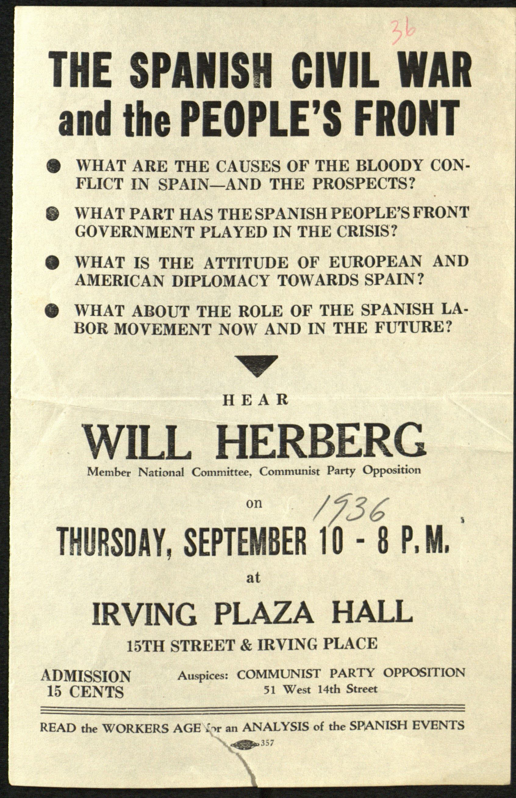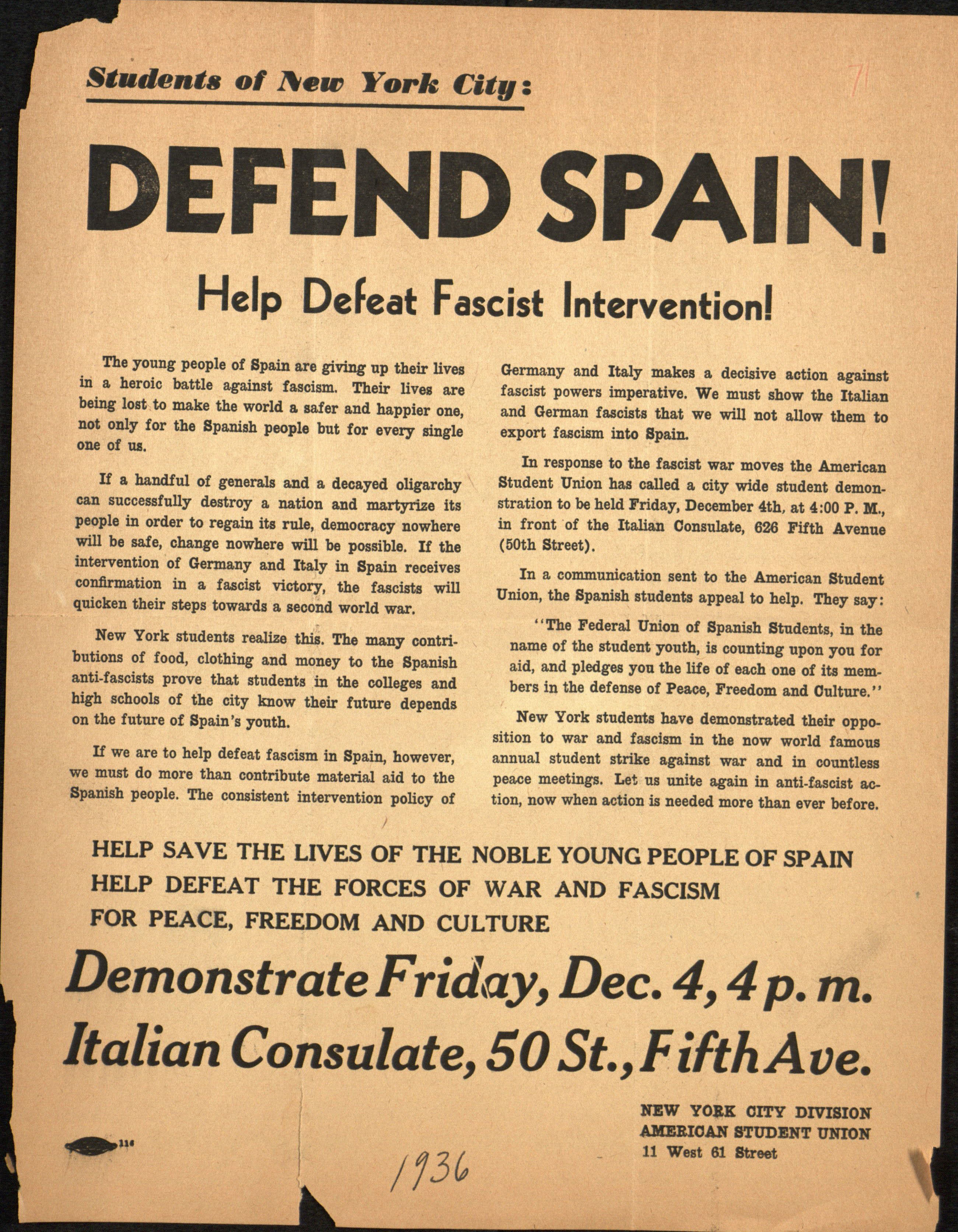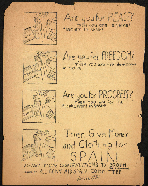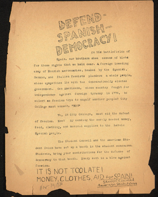 This series of student-made flyers, pamphlets, and zines were created between 1936 and 1937, in the midst of the Spanish Civil War. They served as political propaganda, notices for political guest speakers such as Will Herberg of the Communist Party Opposition, informational aid and a call for the collection of donations and contributions of different forms, for those who fought in the front lines of this war. Some of them relate political events arising in Spain and the way they impact the politics of the United States, while others include drawings of comics, which show the true D.I.Y. (“do it yourself”) spirit of many of these student councils, such as the CCNY Aid Spain Committee and the Student Council. The purpose behind these pamphlets and flyers is to promote democracy and peace as a response against the rise of fascism among CCNY students and professors. This collection was co-curated by Amando Clemente and Melanie Matonte.