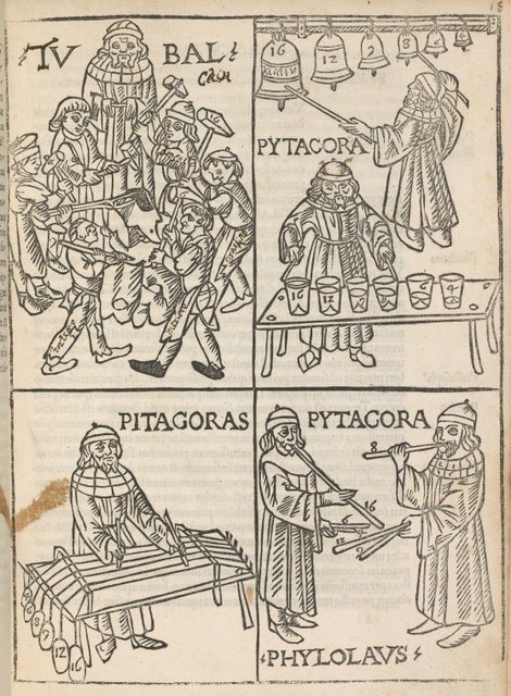Image celebrates Pythagoras's discovery of the perfect intervals, showing him in four scenes: first, hearing the blacksmiths and the different sounds of their hammers; second, experimenting with different sized bells and glasses full of different amounts of water; third, using a weighted monochord; fourth, playing pipes of different lengths.