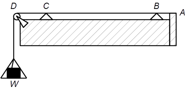 In this diagram, shown in section, the string is connected at letter A, pulled tight across two bridges (marked as B and C), passes over a freely moving wheel (D), and connected to a weight (W) which holds the tension.