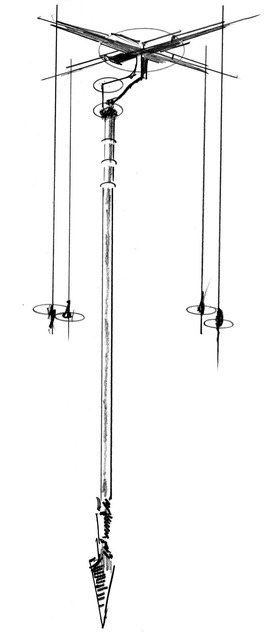 The groma was an ancient survey instrument used often by the Romans. Its origins may go back to Mesopotamia as early as the 4th century BCE. It was a complicated piece of equipment consisting of a vertical staff with right-angle crosspieces attached horizontally. Each crosspiece had its own plumb bob. The groma was limited to surveying straight lines and perpendiculars, but it allowed for simple measuring of rectangular areas (Illustration by Dan Patterson).