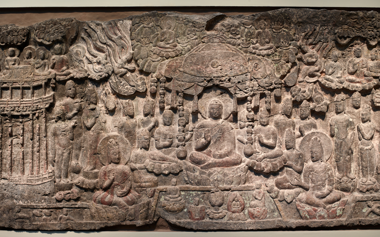 Front Image: Guanyin, white robed, seated upon an over-hanging rock National Museum of Asian Art Smithsonian, https://www.si.edu/object/guanyin-white-robed-seated-upon-over-hanging-rock:fsgF1903.110 . Background Image: Western Paradise of the Buddha Amitabha National Museum of Asian Art Smithsonian, https://www.si.edu/object/western-paradise-buddha-amitabha:fsgF1921.2