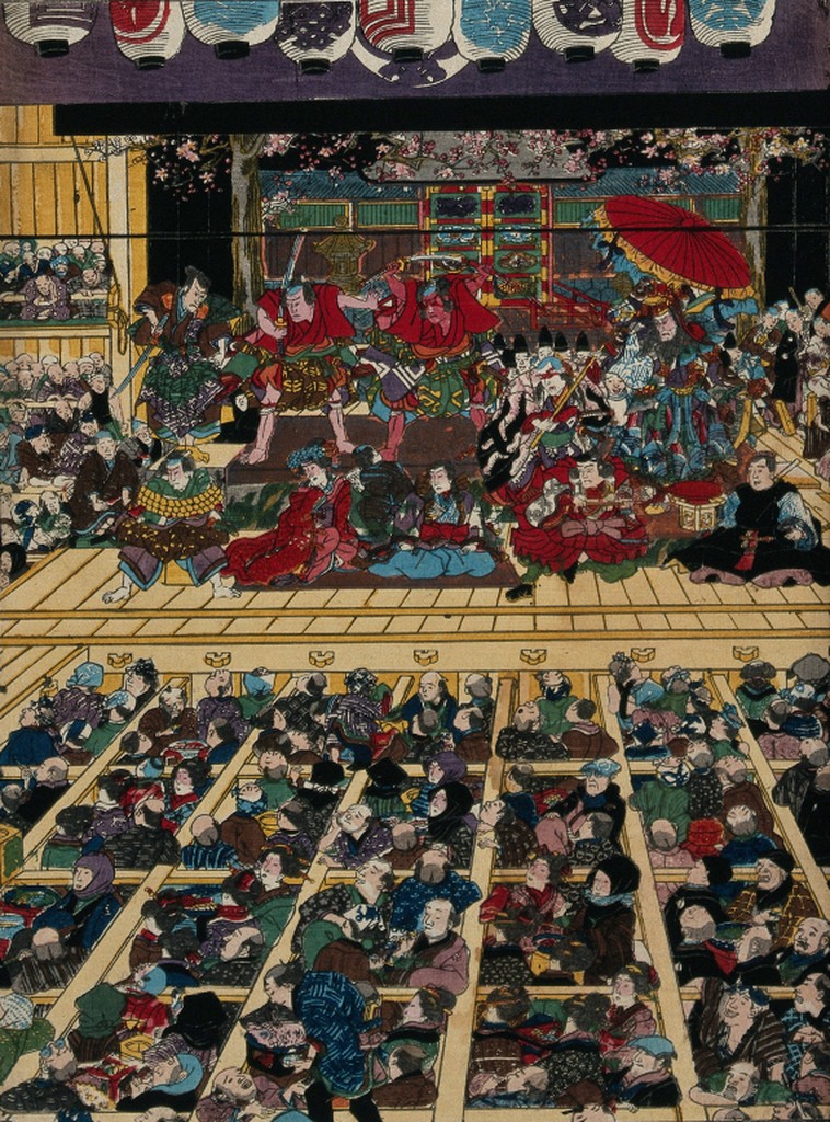 Entry by Daysi Perez Mendez: Perpsective View (uki-e) of a Kabuki Theatre, with a Performance of The Crest Patterns of the Soga Brothers and Nagoya Sanza (Mon-zukushi Nagoya Soga)