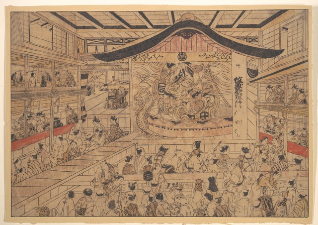 Entry by Eric Carvente: Perspective View (uki-e) of a Kabuki Theatre, with a Performance of The Crest Patterns of the Soga Brothers and Nagoya Sanza (Mon-zukushi Nagoya Soga)