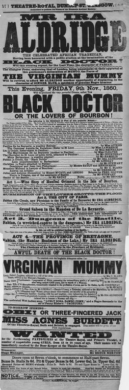 The following image is a newspaper article titled “Mr. Ira Aldridge, the celebrated African tragedian” who is the well known actor of famous melodramatic “The Black Doctor”, which is the alternative title of this newspaper. The newspaper article signifies the impact the play had during its time, especially with racism still taking place. A play which tackled the topic of racism and its significance on a black person living within an oppressive society. To truly understand the significance of such an article, one must understand why having his name headlining a newspaper is historic. Newspapers during such a period do not freely give away headlines to theater actors, even if one has passed away, especially those who were black as well. It was still a predominantly white society, where discrimination and racisum was very much present. Merely the color of your skin still dictated where you belonged in society, and the status you can hold.. The play signifies such a message, where Fabian faces the internal struggles of removing society's shackles from himself mentally. Where he still has to live in fear of loving someone that does not share his skin color, Pauline. From the article, the words “Lovers of Bourbon” are shown underneath black doctor acknowledging Fabiana and Paulines relationship. The words underneath that aren't quite clear to see, but are the acts of the overall play published; the last one stating “Awful death of the Black doctor” which already spoils the play's ending. Overall, a play that tackles the concept of racism has to face such notions outside of it as well. Which makes this newspaper article highly significant for showcasing strides Ira Aldridge was able to take during this era.