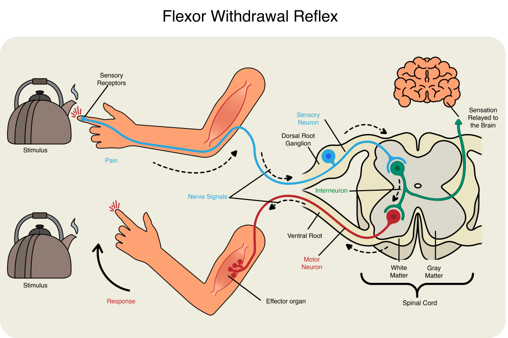 A different somatic spinal nerve reflex involves the response to pain, like when you touch a hot stove and in response withdrawal your arm, typically before you have even registered the pain in your hand. This reflex is called the flexor withdrawal reflex, and it stimulates the withdrawal of the arm through a connection in the spinal cord that leads to contraction of the biceps brachii. Unlike the stretch reflex, the flexor withdrawal reflex is polysynaptic and requires 2 spinal cord synapses to activate the motor neuron. As you withdraw your hand from the stove, you do not want to slow that reflex down. As the biceps brachii contracts, the antagonistic triceps brachii that had been activated to extend the arm toward the stove now needs to relax. Because the neuromuscular junction is strictly excitatory, the biceps will contract when the motor nerve is active. Skeletal muscles do not actively relax. Instead the motor neuron needs to “quiet down,” or be inhibited. In the hot-stove withdrawal reflex, this occurs through an interneuron in the spinal cord. The interneuron’s cell body is located in the dorsal horn of the spinal cord. The interneuron receives a synapse from the axon of the sensory neuron that detects that the hand is being burned. In response to this stimulation from the sensory neuron, the interneuron then inhibits the motor neuron that controls the triceps brachii, in what is known as reciprocal inhibition. This is done by releasing a neurotransmitter or other signal that hyperpolarizes the motor neuron connected to the triceps brachii, making it less likely to initiate an action potential. With this motor neuron being inhibited, the triceps brachii relaxes. Without the antagonistic contraction, withdrawal from the hot stove is faster and keeps further tissue damage from occurring.