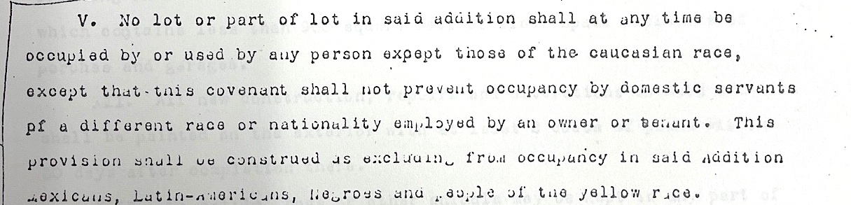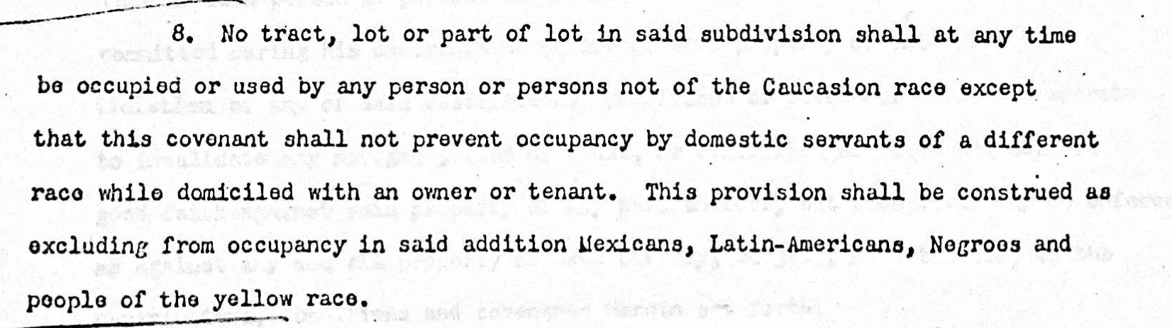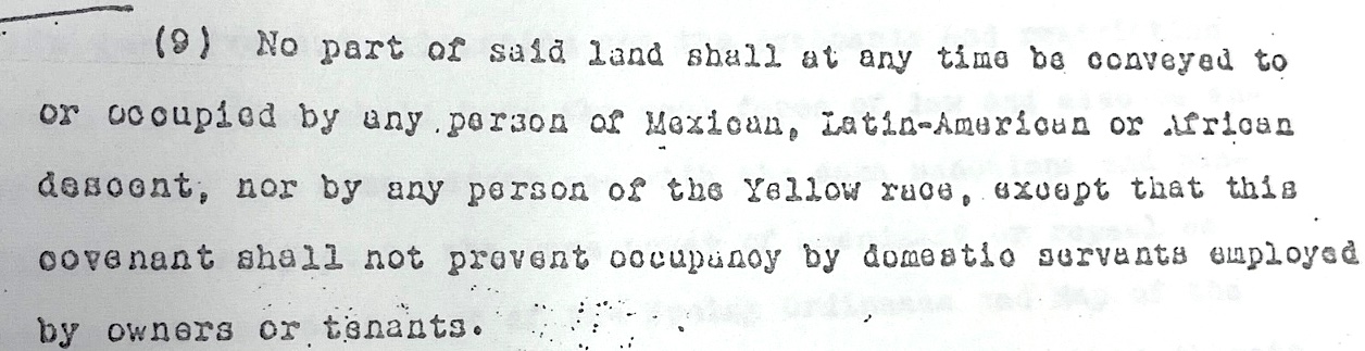 TEXT: “No part of said land shall at any time by conveyed to or occupied by any person of Mexican, Latin-American or African descent, nor by any person of the Yellow race, except that this covenant shall not prevent occupancy by domestic servants employed by owners or tenants.”