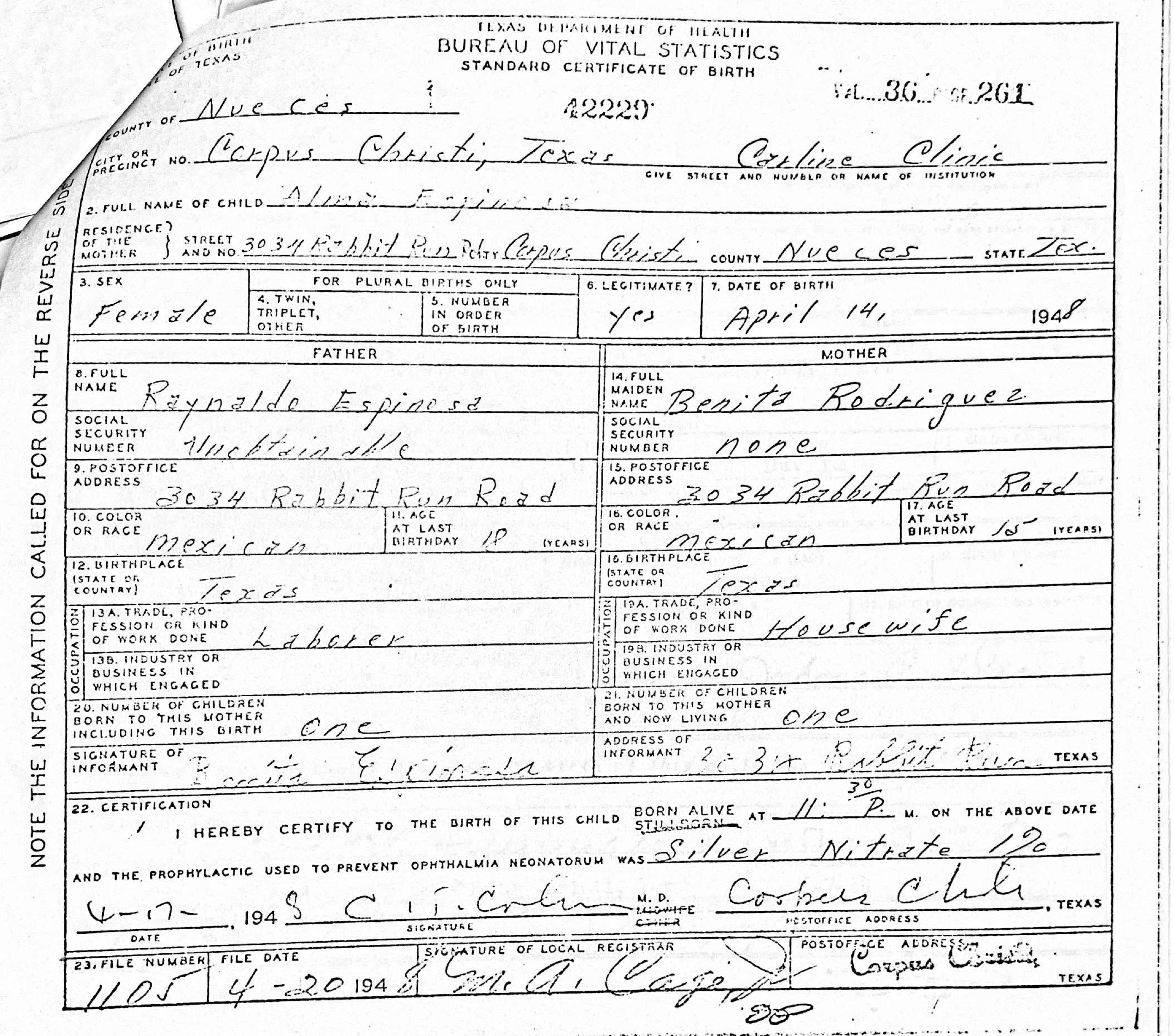Birth Certificate of Alma Espinosa, born in 1948, listing the race of both parents, born in Texas, as “Mexican.”