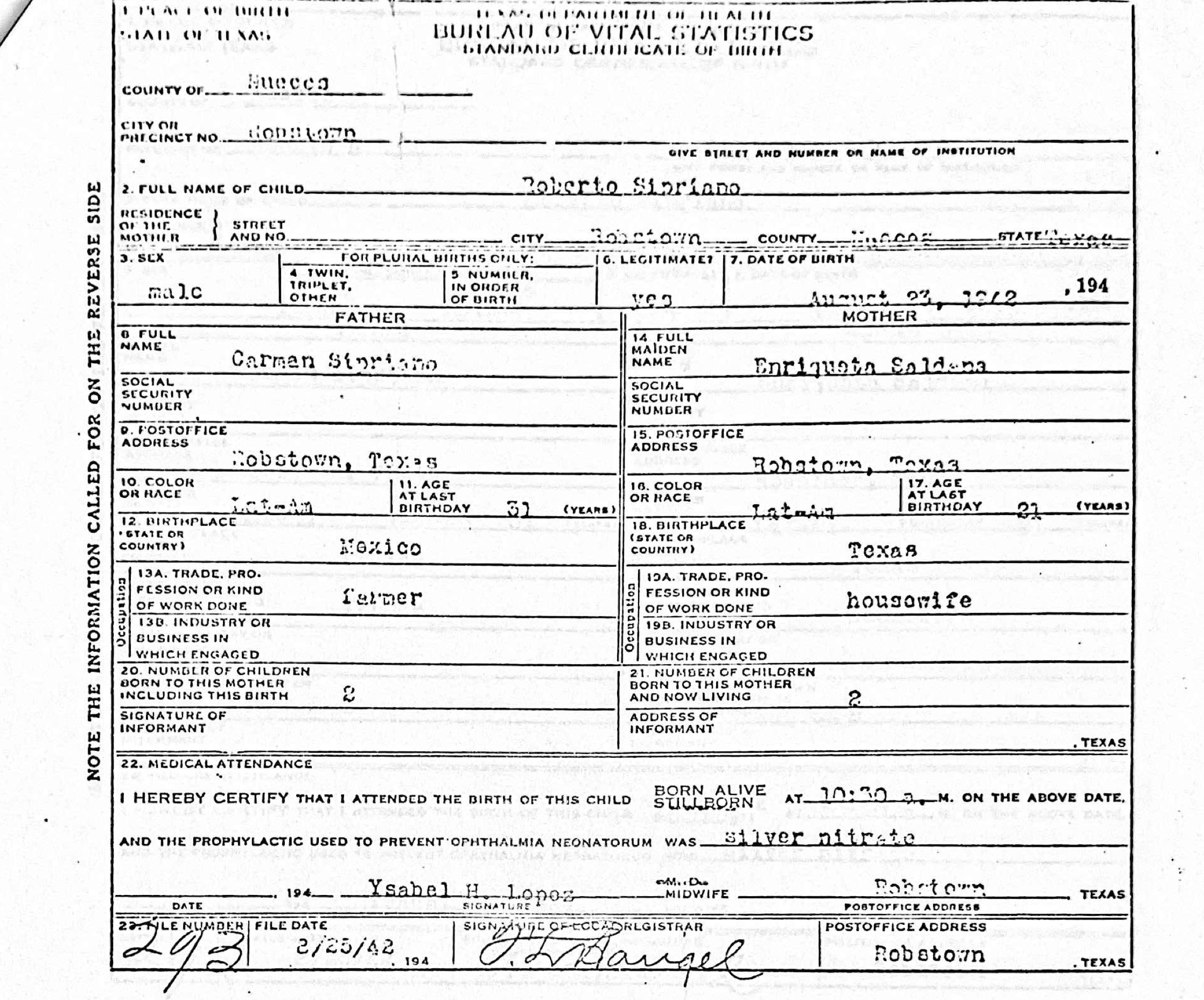 Birth certificate of Roberto Sipriano, born in 1942, listing the race of both parents as “Lat-Am” (Latin American)
