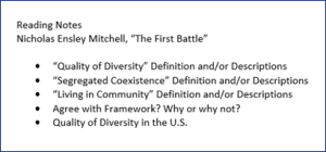 While I don’t have to answer every bulleted question (I know this because I’m asked to “consider questions like”), I want to think about whether I agree with Mitchell’s framework or have ideas of my own. I also have to think about the connection between Mitchell’s ideas and the quality of diversity in the US.