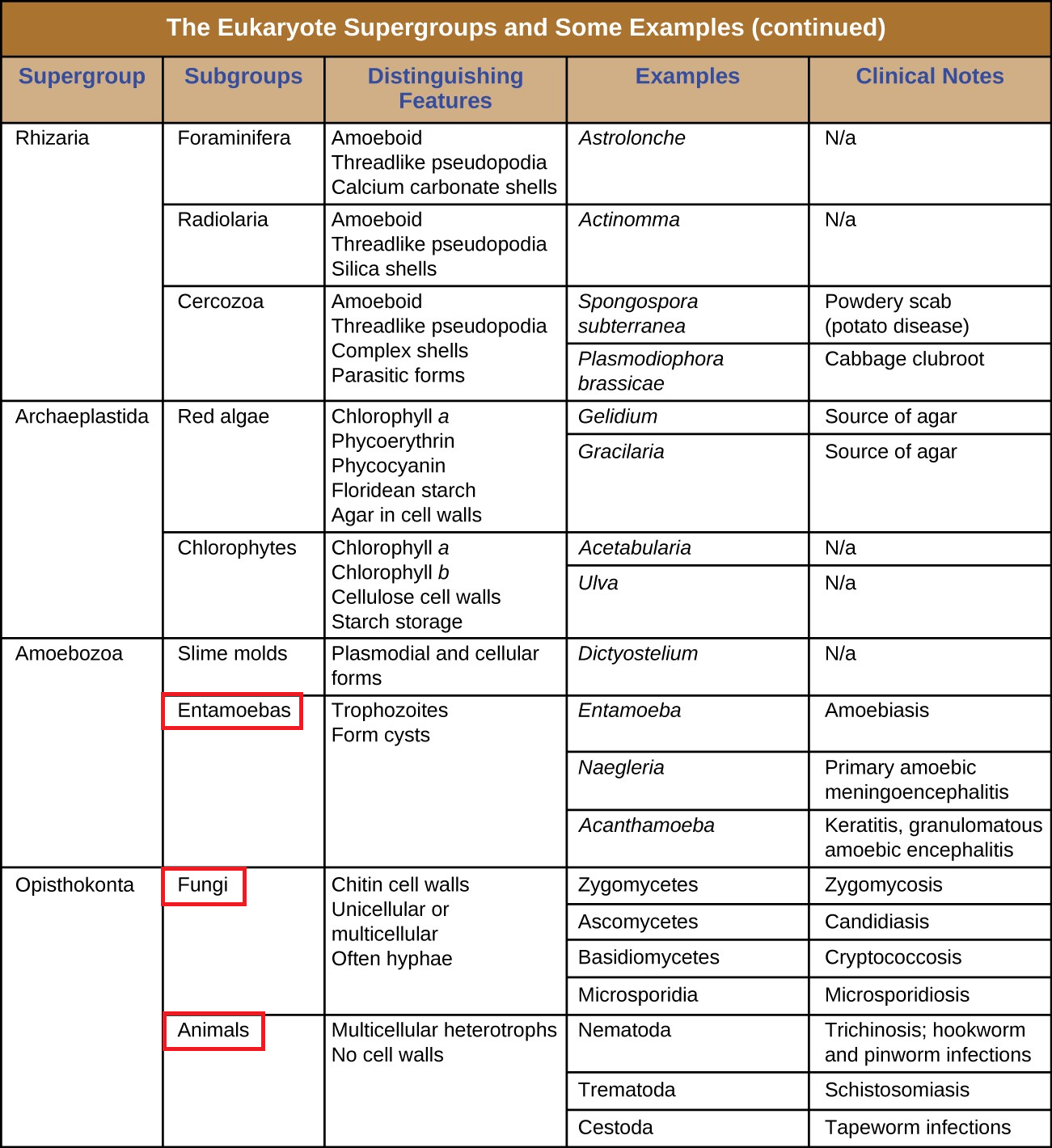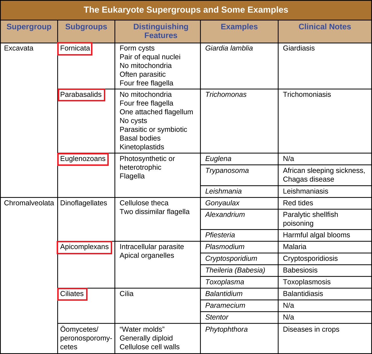 Figure 4.6 Table showing the Eukaryote Supergroups, with the subgroups of particular importance to human health outlined in red.