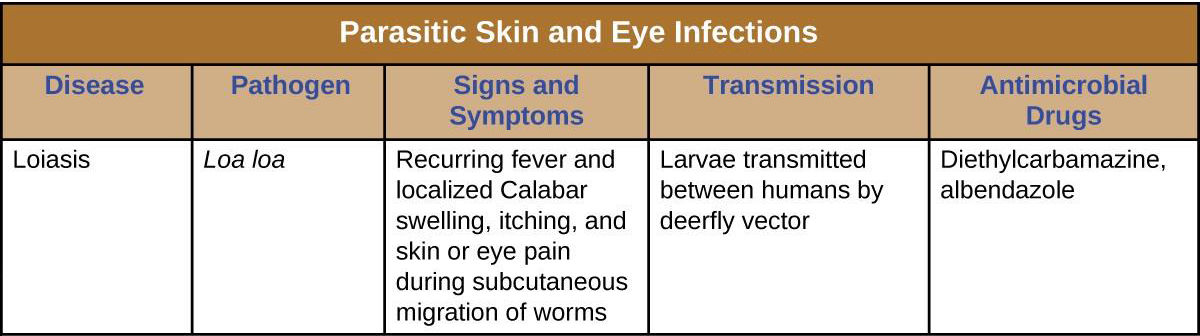 The protozoan Acanthamoeba and the helminth Loa loa are two parasites capable of causing infections of the skin and eyes. Figure 16.25 summarizes the characteristics of some common fungal infections of the skin.