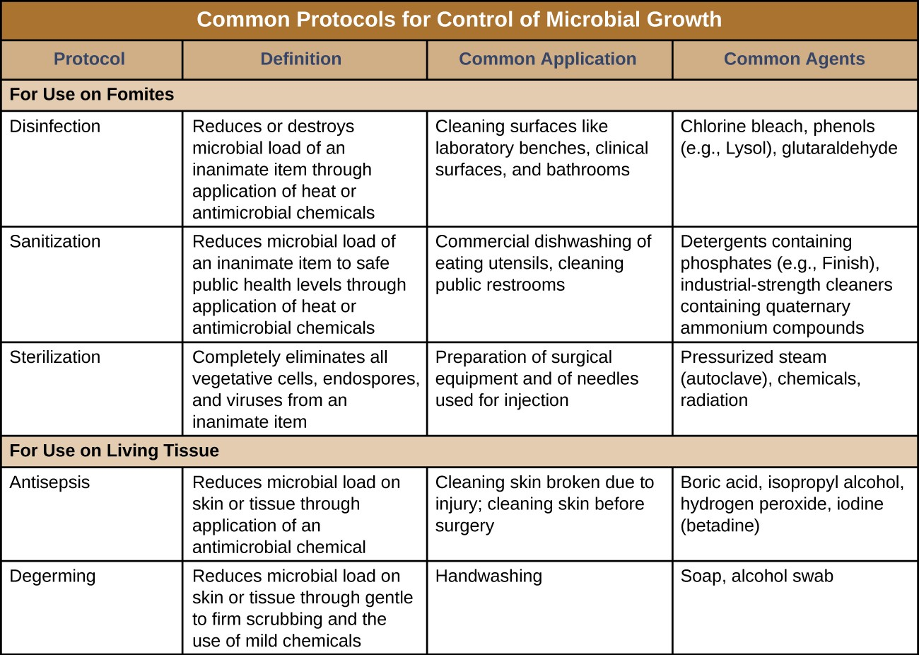 The term sanitization refers to the cleansing of fomites to remove enough microbes to achieve levels deemed safe for public health. For example, commercial dishwashers used in the food service industry typically use very hot water and air for washing and drying; the high temperatures kill most microbes, sanitizing the dishes. Surfaces in hospital rooms are commonly sanitized using a chemical disinfectant to prevent disease transmission between patients. Figure 9.4 summarizes common protocols, definitions, applications, and agents used to control microbial growth.