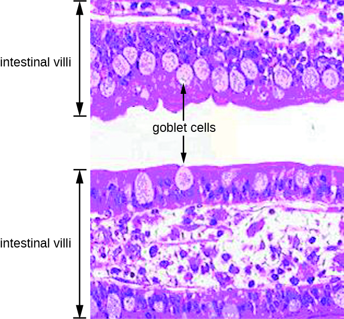 The GI tract has several other methods of reducing the risk of infection by pathogens. Small aggregates of underlying lymphoid tissue in the ileum, called Peyer’s patches (Figure 19.5), detect pathogens in the intestines via microfold (M) cells, which transfer antigens from the lumen of the intestine to the lymphocytes on Peyer’s patches to induce an immune response. The Peyer’s patches then secrete IgA and other pathogen-specific antibodies into the intestinal lumen to help keep intestinal microbes at safe levels. Goblet cells, which are modified simple columnar epithelial cells, also line the GI tract (Figure 19.6). Goblet cells secrete a gel-forming mucin, which is the major component of mucus. The production of a protective layer of mucus helps reduce the risk of pathogens reaching deeper tissues.