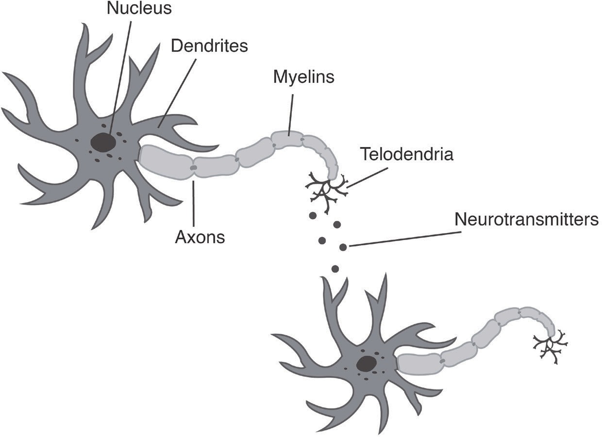 Each neuron has a “nucleus” as the central core of a wide reaching branch-like set of tendrils or receptors called “dendrites.” These gather impulses in the form of neurotransmitters and pass them down a linked chain of myelin coated nodes called the ‘axon’ that ends in a smaller web of transmitters called “telodendria.”