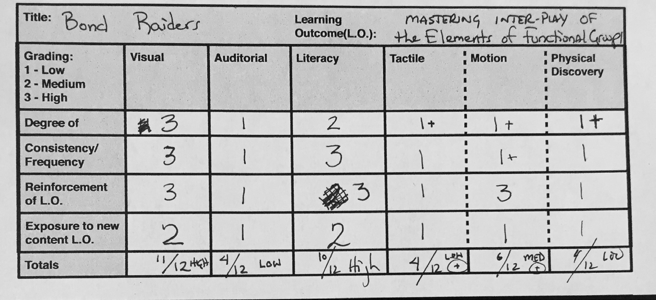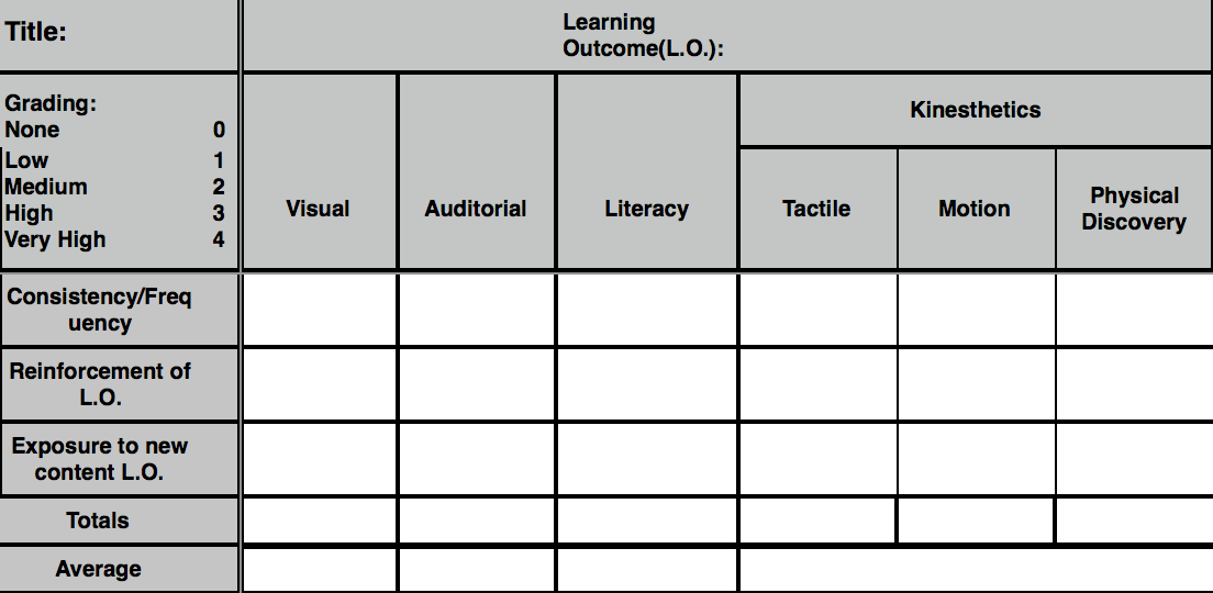 The process began with the team setting up a simple score card listing out the four teaching modes outlined by Fleming (Visual, Auditory, Reading/Writing, and Kinesthetic), and involving a three-step scale of low, medium, and high. I had them test this by applying the rubrics to a variety of imagined learning situations; consequently, it became obvious that the generality of the term “kinesthetic” made for problematic assessments. We were not actually considering the variety of conditions that might be possible.