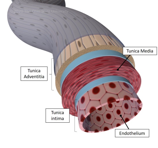 The arterial system is a relatively high-pressure system, so arteries have thick walls that appear round in cross section (Figure 20.3). The venous system is a lower-pressure system, containing veins that have larger lumens and thinner walls. They often appear flattened. Arteries, arterioles, venules, and veins are composed of three tunics known as the tunica intima, tunica media, and tunica externa. Capillaries have only a tunica intima layer. The tunica intima is a thin layer composed of a simple squamous epithelium known as endothelium and a small amount of connective tissue. The tunica media is a thicker area composed of variable amounts of smooth muscle and connective tissue. It is the thickest layer in all but the largest arteries. The tunica externa is primarily a layer of connective tissue, although in veins, it also contains some smooth muscle. Blood flow through vessels can be dramatically influenced by vasoconstriction and vasodilation in their walls.