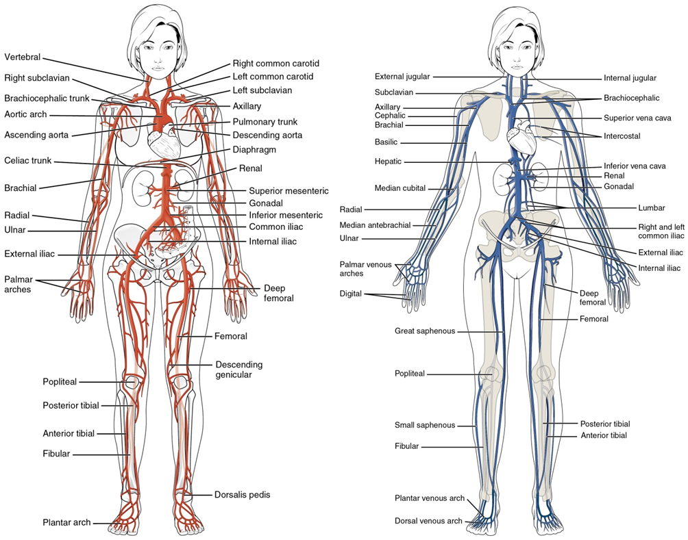 - List the main arteries and veins blood follows as it travels from the heart to the rest of the body and back to the heart again.