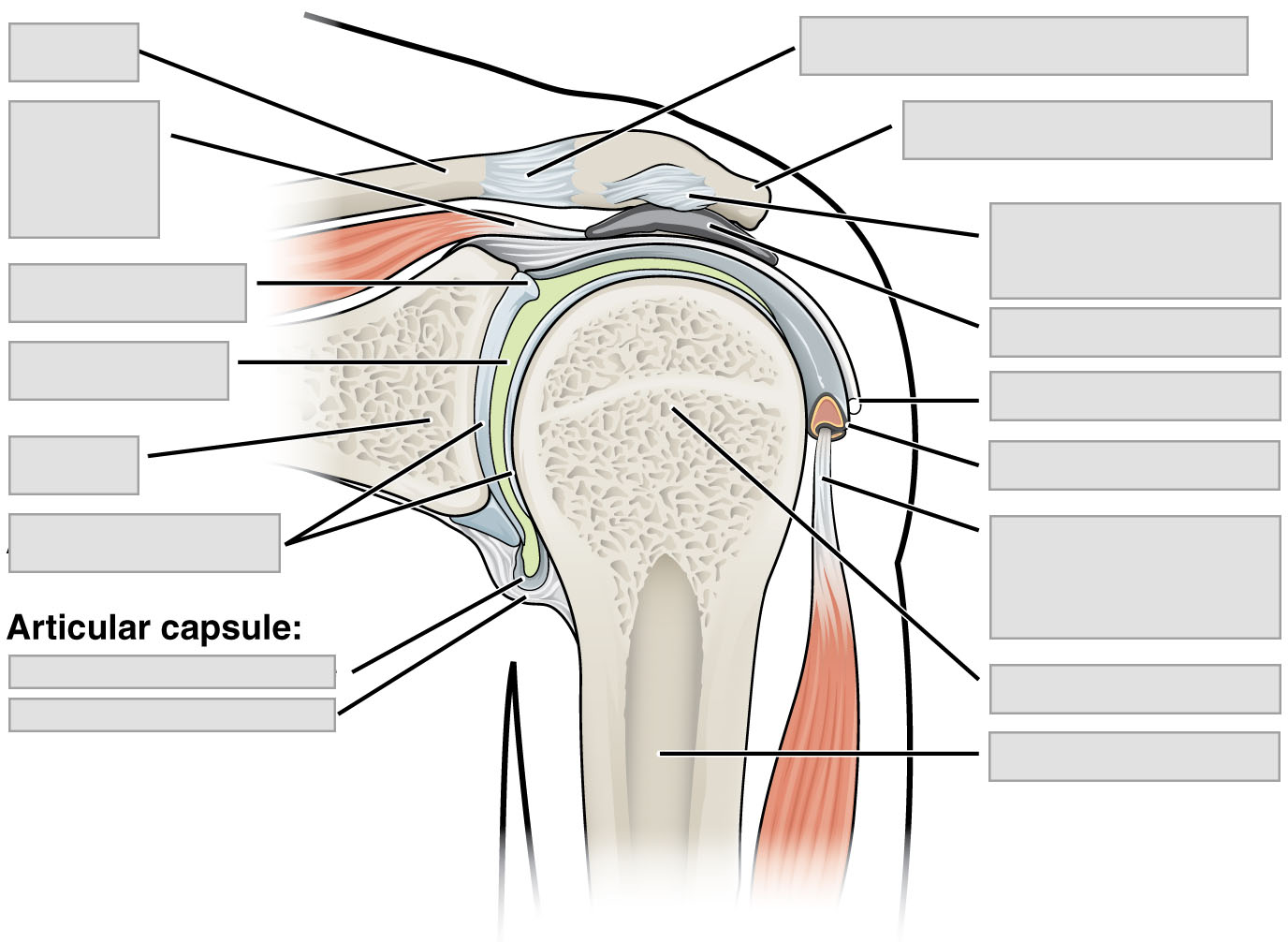 · Acromioclavicular joint · Glenoid labrum · Acromion of scapula · Head of humerus · Articular capsule – synovial membrane · Humerus · Articular capsule – fibrous membrane · Tendon of supraspinatus muscle · Articular capsule · Scapula · Articular cartilage · Subacromial bursa · Clavicle · Tendon of biceps brachii muscles (long head) · Coracoacromial ligament · Tendon sheath · Glenoid cavity