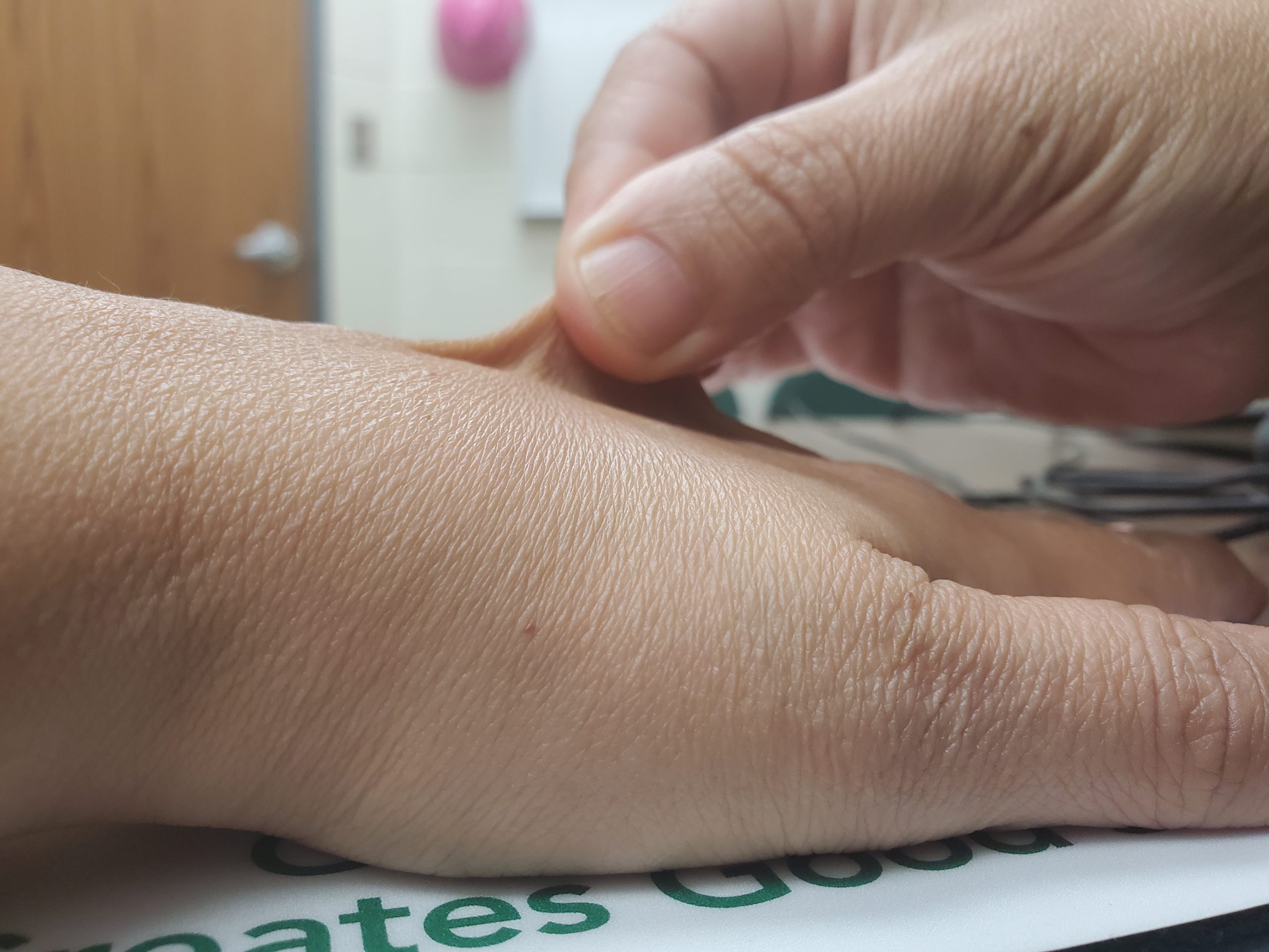 Ensuring that patients are sufficiently hydrated is an important part of nursing care. Intake of fluids as well as ability to pump fluids (blood) to the kidneys and away from tissue spaces are all equally important. Nurses can determine a patient is dehydrated severely if they have low blood pressure, high heart rate, cold hands and feet and low urine output. In the hospital setting dehydration can be treated. The figure shows how to do a skin turgor test for assessment of dehydration. To check skin turgor: use the thumb and index fingers to pinch an area of the skin and release it (Figure 26.1) . It should instantly return to place. Try this with your classmates!
