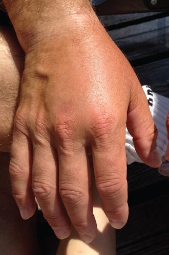 The image shows edema or swelling in the hand tissues of a patient. Edema refers to abnormal accumulation of interstitial fluid. As a nursing student you are trying to figure out what may have caused this issue.
