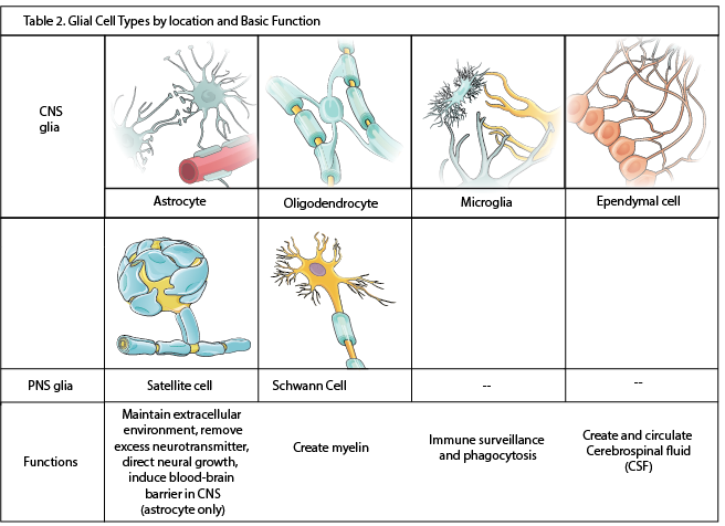 The nervous system has several types of glial cells, categorized by the anatomical division in which they are found. In the CNS, astrocytes, oligodendrocytes, microglia, and ependymal cells perform different functions that support neurons. Astrocytes maintain the chemical environment around neurons and are crucial for regulating the blood-brain barrier. Oligodendrocytes myelinate neurons, microglia act as phagocytes and play a role in immune surveillance. Ependymal cells filter blood to produce cerebrospinal fluid (CSF). CSF circulates through the CNS proving nutrients and removing waste. In the PNS, satellite cells maintain the extracellular environment around cell bodies and Schwann cells insulate peripheral axons.