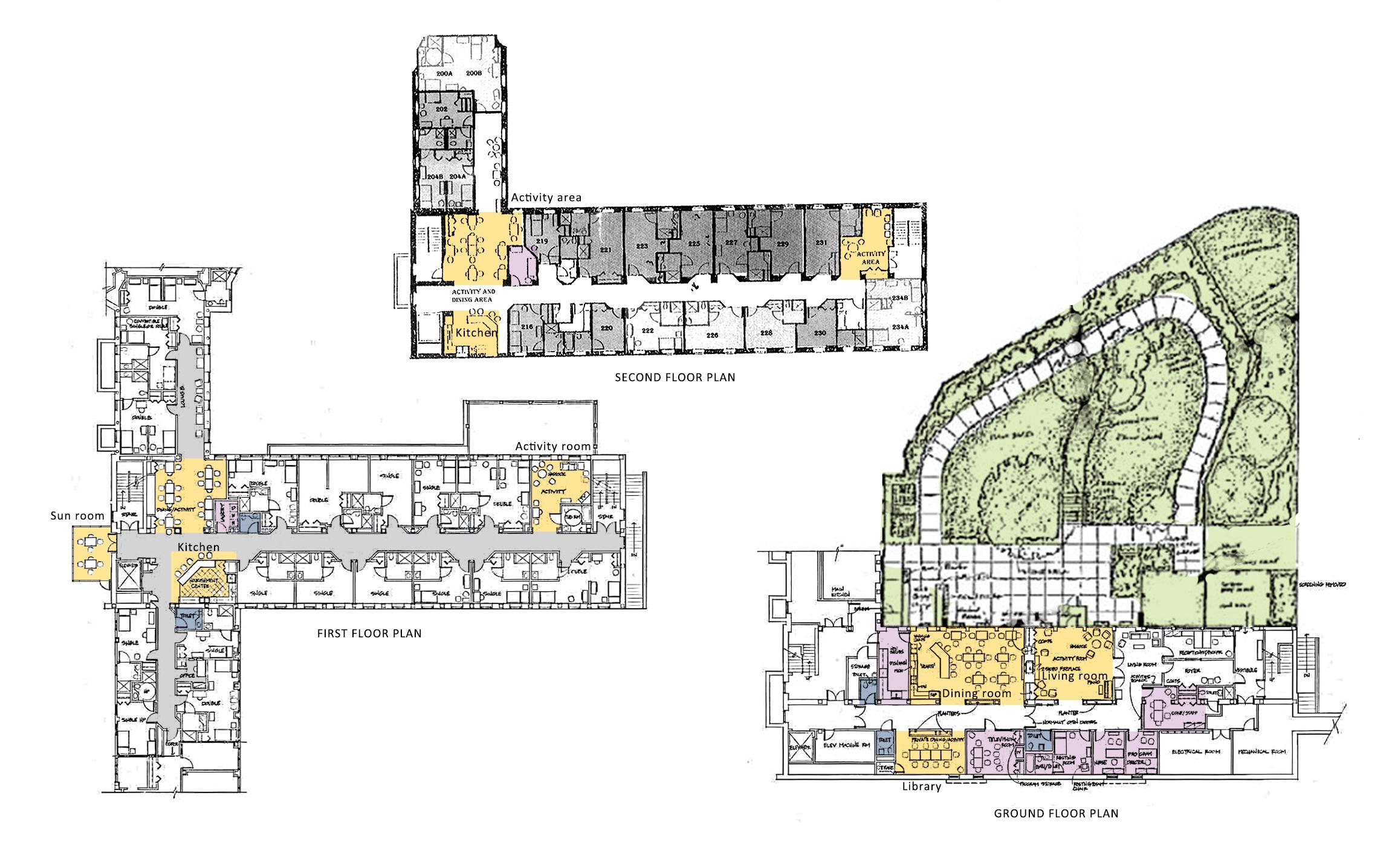 end of the hallway from the open living room on the first floor is a separate activity room for residents in the later stages of dementia, who participated in the “Serenity” program. Close to the open living room is a sunroom overlooking the garden attached to the adjacent assisted living residence, for people without a diagnosis of dementia. The second floor has a similar spatial structure as the first floor, except that most of the residents required less care and joined programs on both the ground and second floors, appropriate for their abilities.