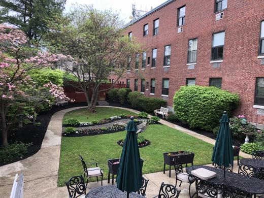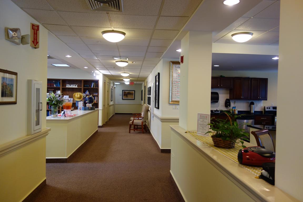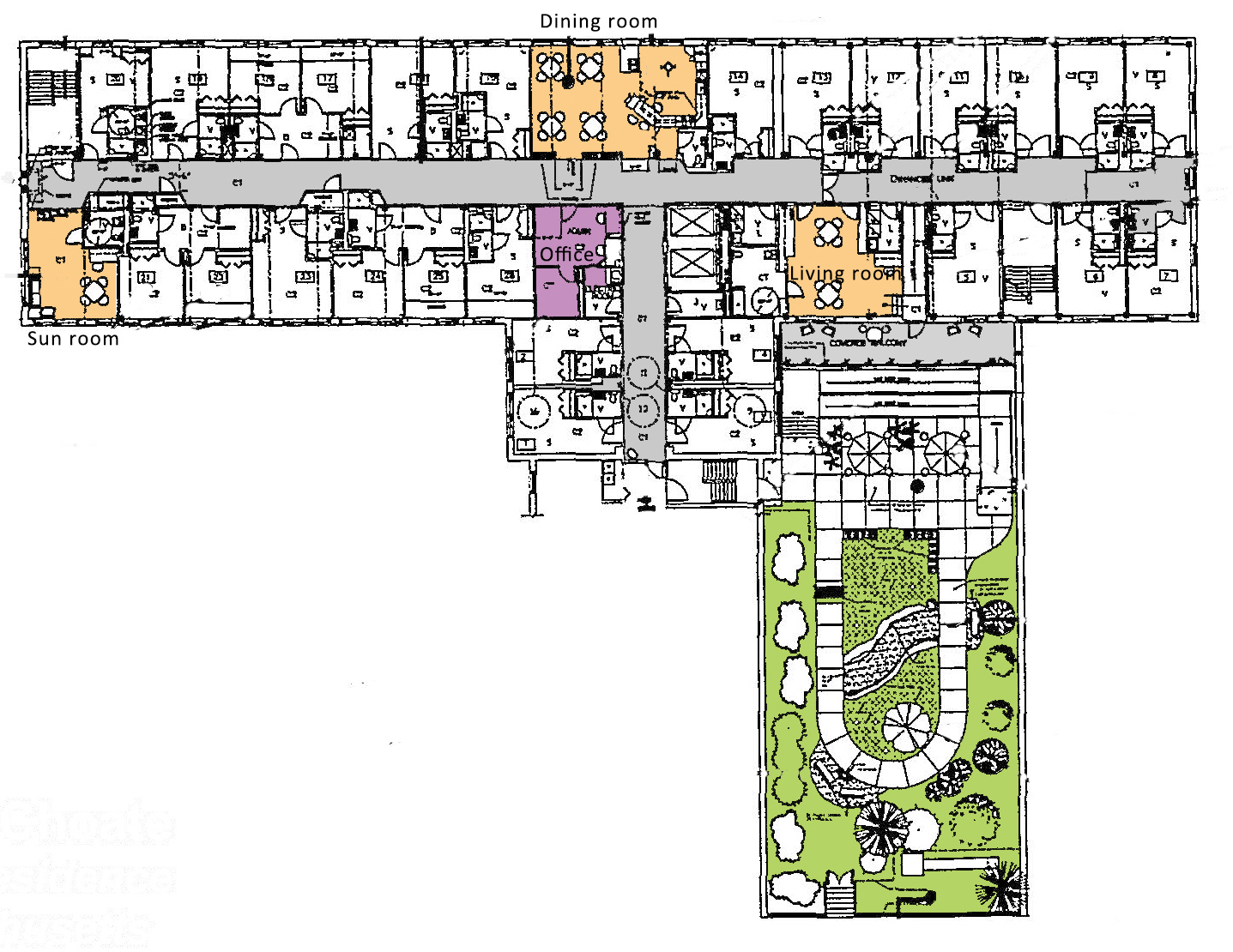 The ground floor or “garden” floor comprises of several offices, a living room, meeting room, library, large dining room with a country kitchen, and “healing” (or therapeutic) garden that can be entered from the living room. One story above the garden floor is the first floor, including an open living room with a small alcove and country kitchen located across an open hallway. The country kitchen has a counter where residents can sit while eating breakfast. Residents on the first floor were of a higher care level than those on the second, one floor up. At the other