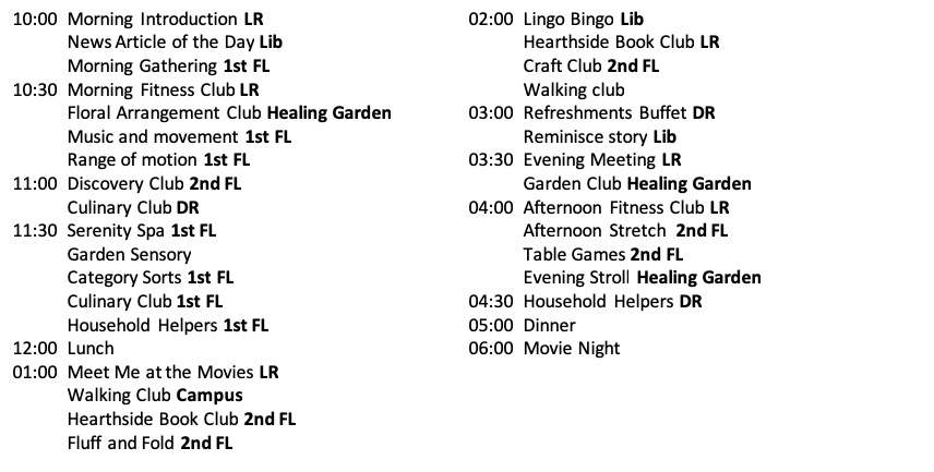 In the “S” residence, different programs focusing on various skill levels are provided for residents in the early, middle, and later-stages of dementia. “Discovery” is targeted towards those in the early stage. “Vitality” is for residents with moderate to mid-stage dementia. “Serenity” is for those in the later stage. These programs are conducted at the same time but in different common rooms, a process called “parallel programming.” The “flow” of the day in the “S” residence was outlined on a blackboard located at the entry of the dining room (see Fig. 1 below, where SR stands for sunroom, LR for living room, and DR for dining room).