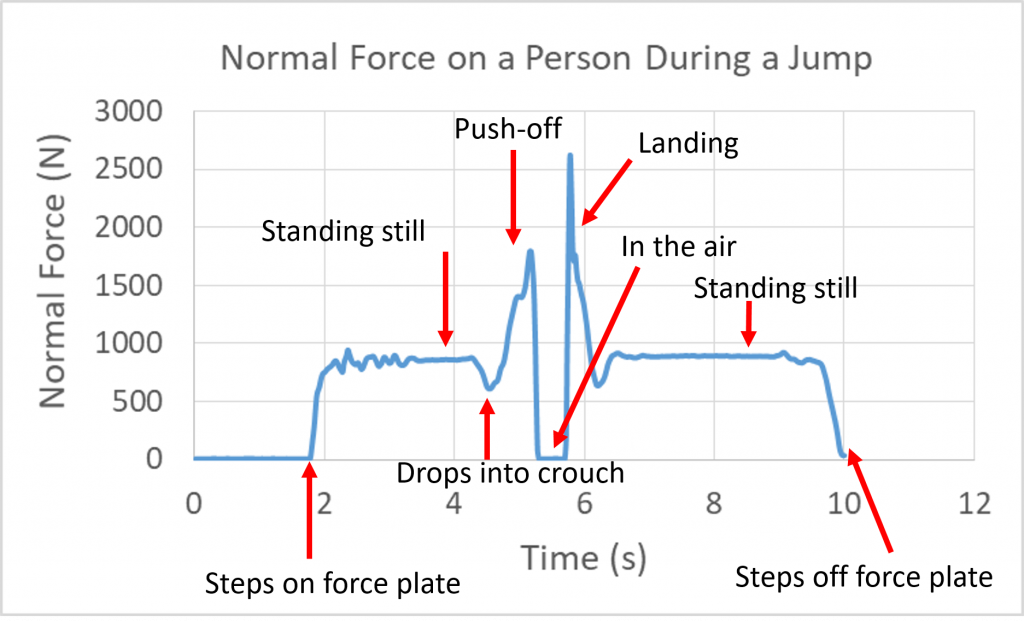 When a person stands still on flat ground, they are in static equilibrium and the normal force pushing up from the ground is equal to their weight. In order to jump, the muscles of the leg contract to push down against the floor. This downward push results in an equal reactive normal force from the floor, so that now the normal force is greater than body weight a there is an upward net force. Now with an upward net force, the body will experience an upward acceleration. The following graph of the normal force on person was created by jumping and landing on a force plate, which is essentially a extra-tough digital scale that records the normal force that it provides over time.