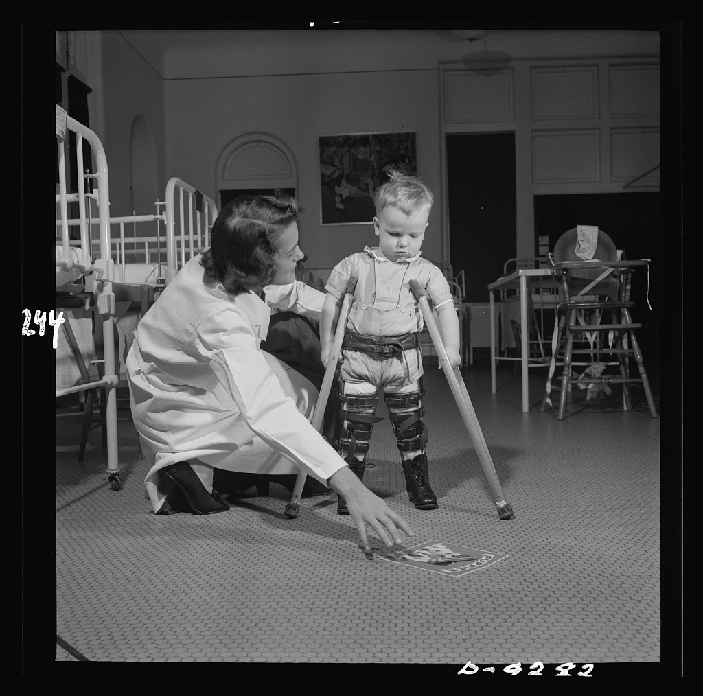 Friction between the crutches and the floor prevents the young boy’s crutches from sliding outward even when they aren’t held straight vertical. This 1942 photo by Fritz Henle was captioned “Nurse training. Using the picture book as bait, the physical therapist encourages a young victim of infantile paralysis [Polio] to learn to use his catches (crutches).”  Polio was effectively eradicated from the United States by the polio vaccine, originally developed by Jonus Salk  “who never patented the vaccine or earned any money from his discovery, preferring it be distributed as widely as possible.” There are two types of vaccine that can prevent polio: inactivated poliovirus vaccine (IPV) and oral poliovirus vaccine (OPV). Only IPV has been used in the United States since 2000 and 99% of children who get all the recommended doses of vaccine will be protected from polio.