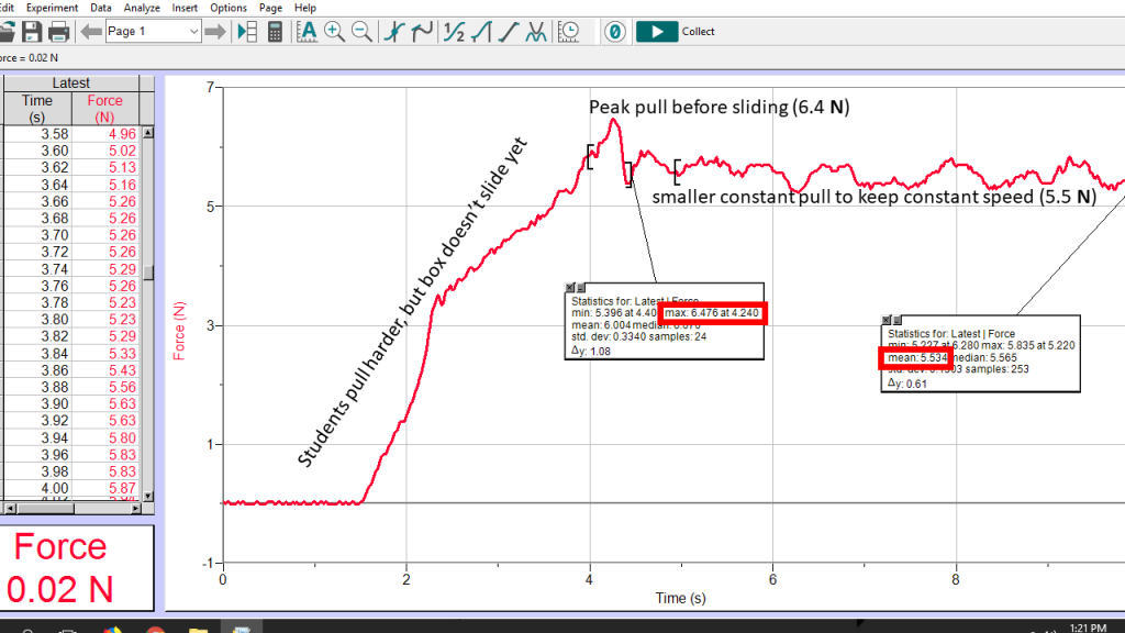 Pull force applied to a box on a table. The students pulled lightly at first, then increasingly harder until the box began to slide, and then pulled just right to keep the box moving at constant speed. Notice that as the students pull harder the box has not yet move, which means the static frictional responds and grows larger to maintain static equilibrium. A maximum of static frictional force of 6.4 N is reached before the box begins to slide and kinetic friction takes over. We see that the force drops at this point, meaning that the students had to reduce their pull force to 5.5 N in order to just balance kinetic friction and maintain a constant speed. This demonstrates that kinetic friction is smaller than static friction. This data is was acquired by Umpqua Community College physics students Libby Fregoso and McKenzie Carrier.