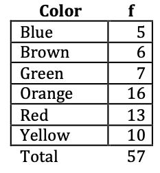 Here is a frequency table for the distribution of colors in a bag of M&Ms candy: