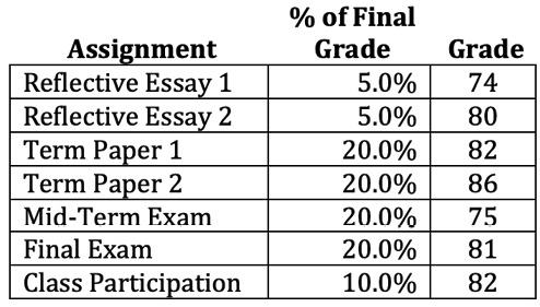 A student received the following grades in her English class. Based on the weights of each assignment, what is this student’s final average for the semester?