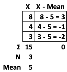 When the mean is subtracted from each of the three variables, we get 3, -1, and -2. The sum of these three numbers is zero.