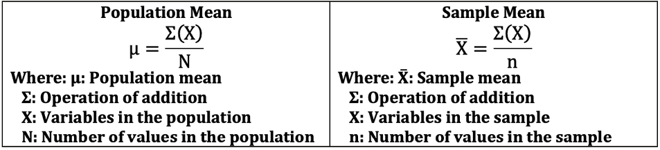When using symbols to write the formula for the mean there are, in fact, two formulas. One for the population mean (μ or the lower-case Greek letter “mu”) and the other for the sample mean (X̅, which is pronounced “X-Bar”). Table 4 shows these formulas:
