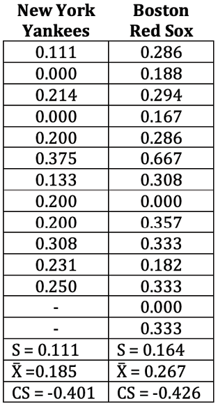 In a few seconds, Excel calculates 13 measures for both teams. The output is shown in Figure 34. Please note: Excel does not format the numbers it reports. The numbers shown in columns D and F were manually formatted. This takes less than a minute. In cells H4:H16, I have added the measures for the Boston Red Sox calculated using Excel’s built-in functions. The results are in n Column H. Column I shows the functions used. This data is available in the workbook titled Chapter05_DescriptiveStat-TooPak.xlsx.