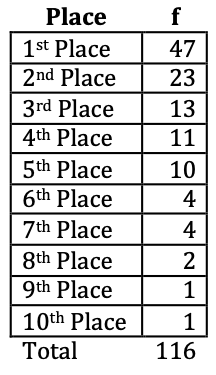 The frequency table shown in Table 5 shows the order of finish for the New York Yankees from 1903 to 2018. Order of finish is an ordinal variable. Frequency, f, is a ratio variable.