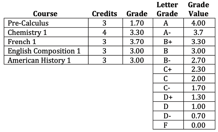 A first semester freshman received the following grades. What is her Grade Point Average for this semester?