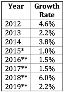 In July 2019, the Consumer Technology Association reported the following annual growth rates for the period between 2012 to 2019 for the U.S. Consumer Electronics category. Using Microsoft Excel, calculate the average annual growth rate for this eight-year period using the arithmetic and geometric means.