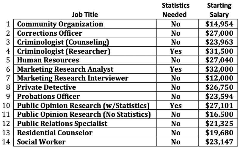We are going to conclude Chapter 1 with a little exercise about which careers offer students more money. I have used this exercise during the first class of the semester. I found it in the January 2006 issue of the journal Teaching Sociology.44 The article, written by Pamela Paxton, is entitled “Dollars and Sense.” A word of caution about the starting salaries presented: The data were collected from 1996 to 2003. It is reasonable to expect that these salaries have increased since then. We will not address the question of whether these salaries have kept pace with inflation.